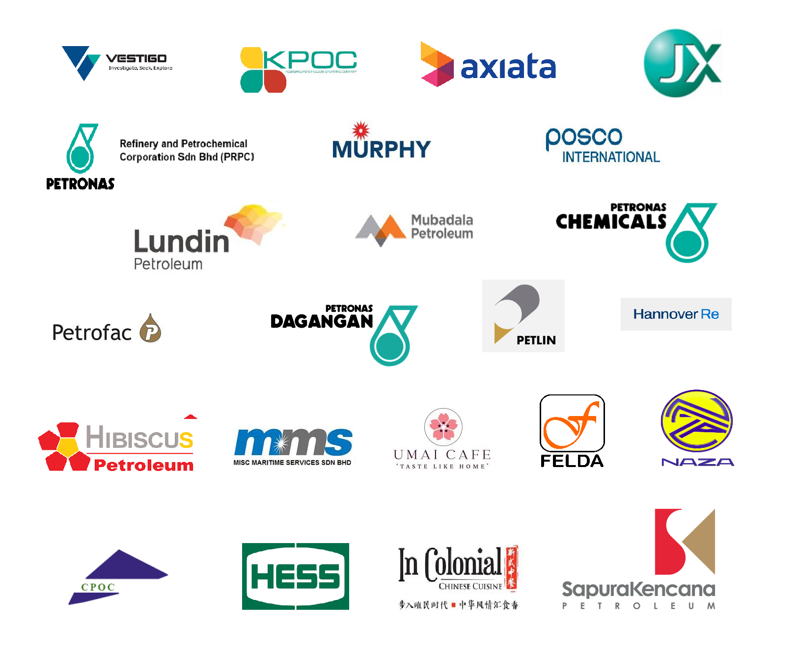 Collage of logos from various companies, including Vestigo, KPOC, Axiata, JX, Petronas, Murphy, Posco International, Lundin Petroleum, Mubadala Petroleum, Petronas Chemicals, Petrofac, Hannover Re, Hibiscus Petroleum, MISC Maritime Services, Umai Cafe, Felda, Naza, CPOC, Hess, In Colonial, and SapuraKencana Petroleum.