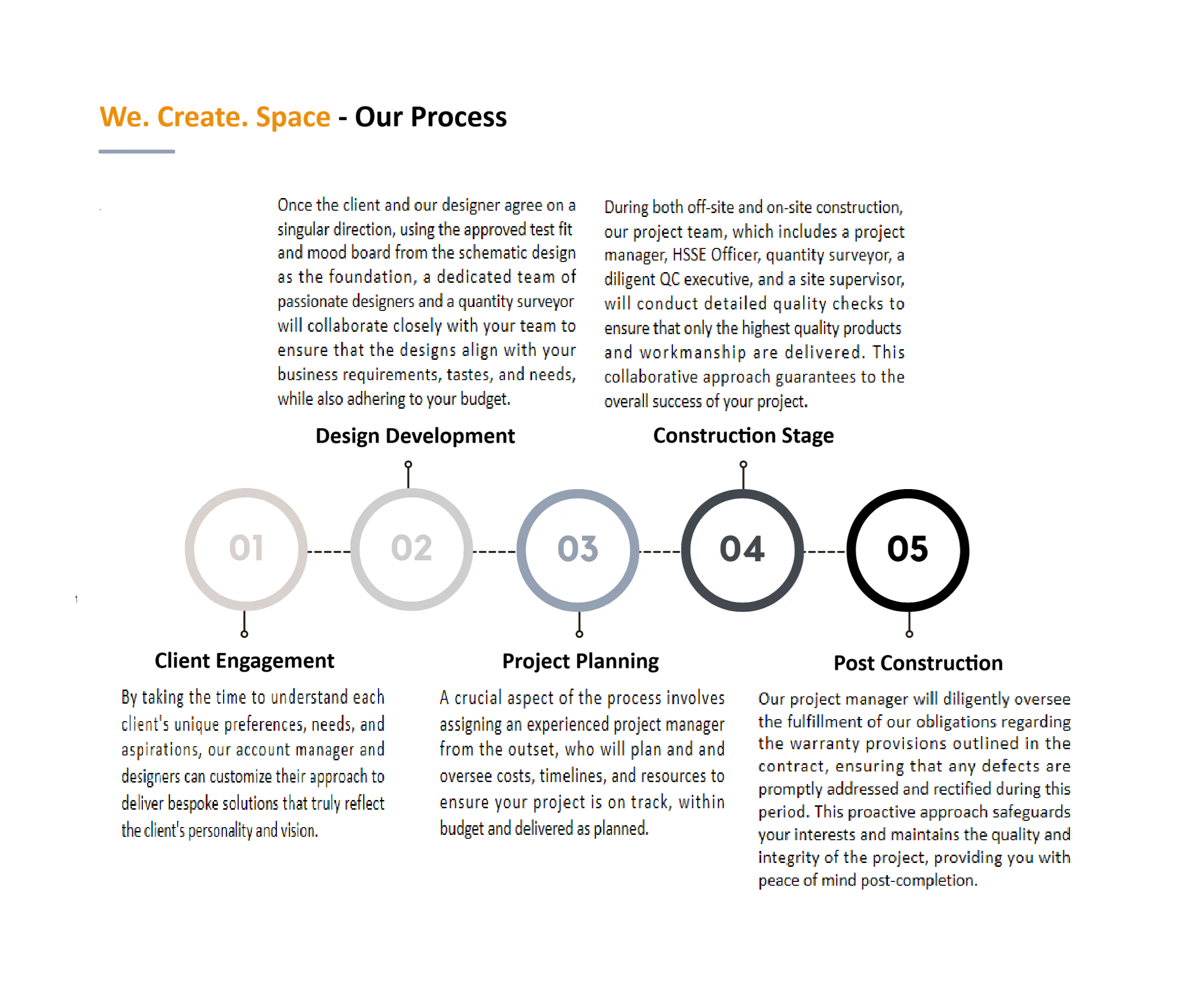 We Create Space. We are passionate about converting spaces to suit our client business requirements and bringing their vision to life, while delivering quality design and products with exceptional service and memorable experiences at cost-effective constructions making every project a rewarding experience tailored to our client needs.